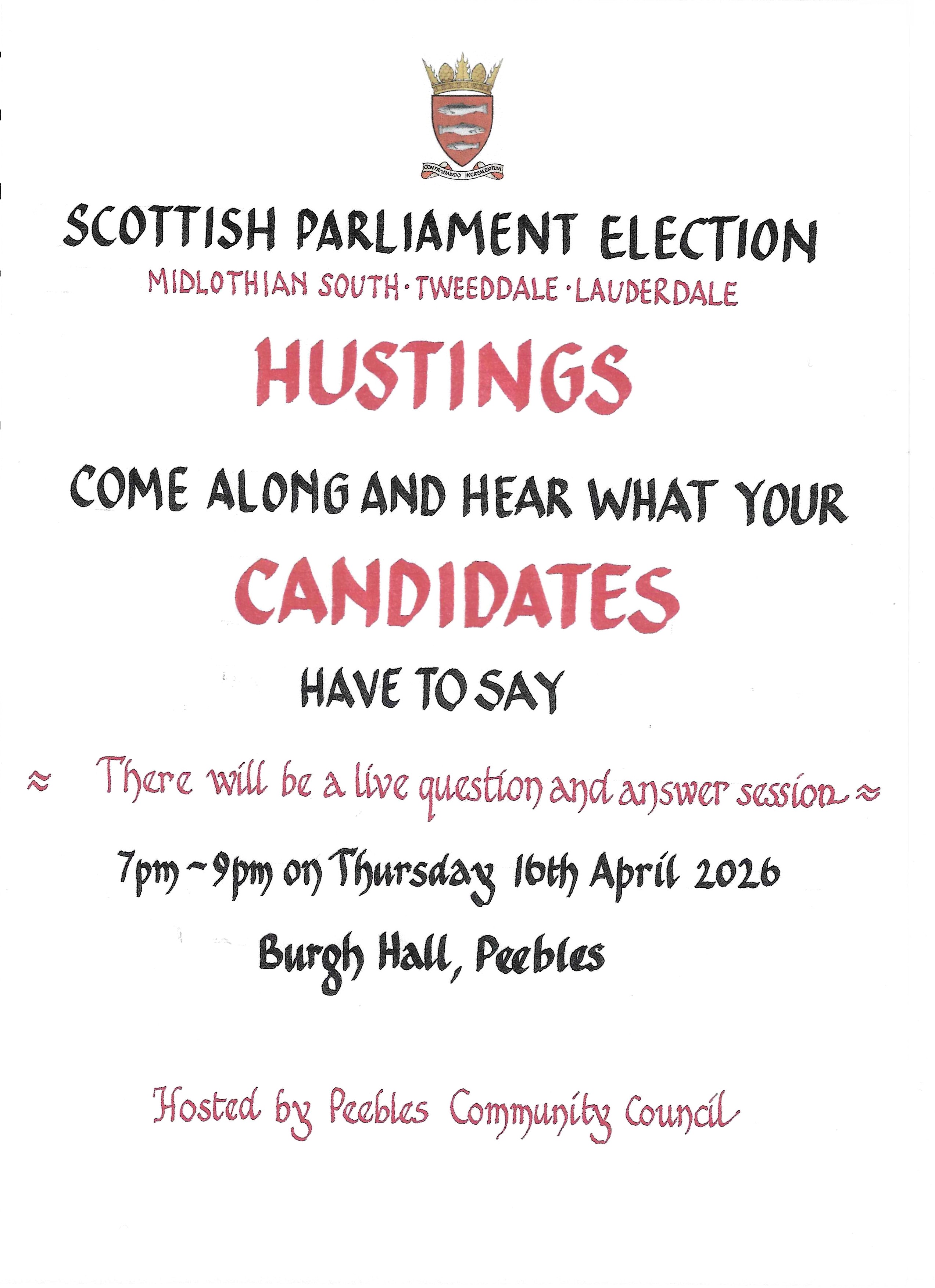 Peebles Community Council will hold hustings, 7–9pm Thursday 16 April in the Burgh Hall, Chambers Institution, Peebles.